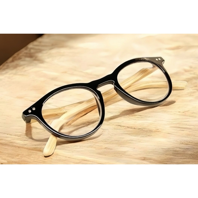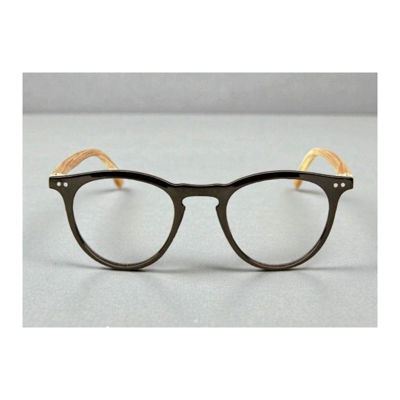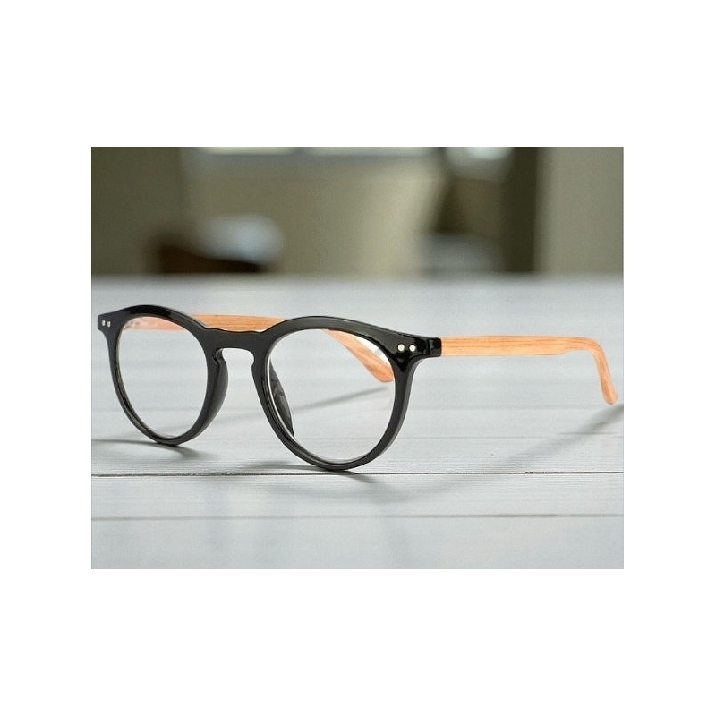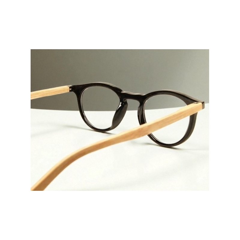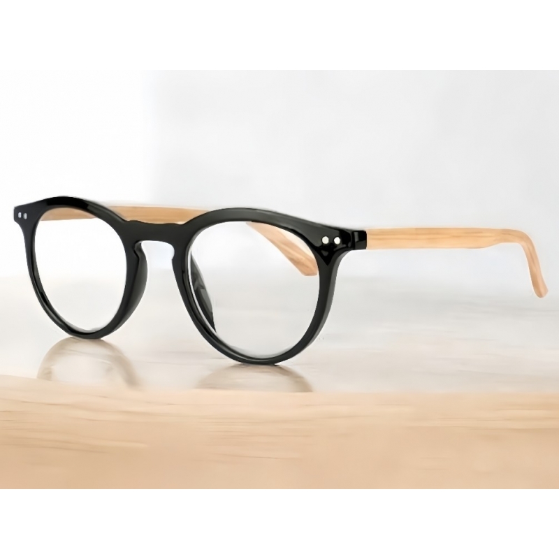 Les lunettes de vision 21 289 A, monture noire brillante avec branches façon bois clair, montées sur ressorts flex sont des lunettes de lecture pour la presbytie et la vision rapprochée, de forme rectangulaire pour un style classique et rétro.